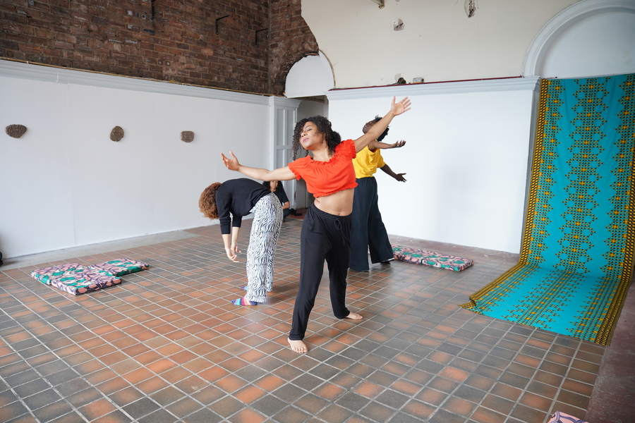 Ashanti Harris, Second Site (2019). Group shot of performers Libby Odai, Natasha Ruwona, Adebusola Ramsay. Photo by Sekai Machache